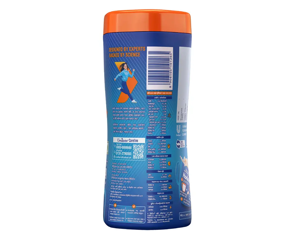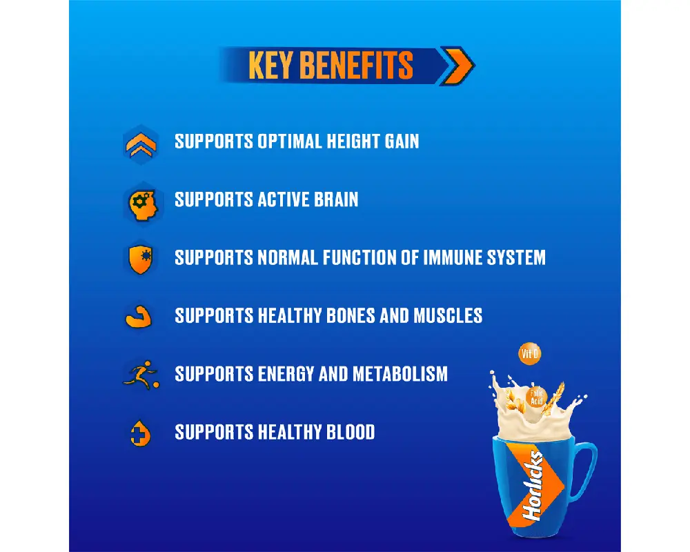 🌾 প্রধান উপাদান মাল্টেড বার্লি গমের আটা মিল্ক সলিডস চিনি সয় প্রোটিন আইসোলেট বিভিন্ন ভিটামিন ও মিনারেল মিনারেল, ইমালসিফায়ার, অ্যাসিডিটি রেগুলেটর ইত্যাদি 🍽️ পুষ্টিগুণ (প্রতি ১০০ গ্রাম প্রায়) এনার্জি: ~376–377 kcal প্রোটিন: ~10–11 g কার্বোহাইড্রেট: ~79 g ফ্যাট: ~2 g ক্যালসিয়াম: ~741 mg আয়রন: ~26 mg ভিটামিন C: ~148 mg ভিটামিন D: ~9.3 µg এছাড়াও ভিটামিন A, B-কমপ্লেক্স, E, জিঙ্ক, আয়োডিন ইত্যাদি রয়েছে। ⭐ সম্ভাব্য উপকারিতা হাড় মজবুত করতে সহায়তা (ক্যালসিয়াম + ভিটামিন D) শরীরে শক্তি যোগায় শিশুদের বৃদ্ধি ও মস্তিষ্কের বিকাশে সহায়তা রোগ প্রতিরোধ ক্ষমতা বাড়াতে সহায়ক পুষ্টি দেয় 🥄 খাওয়ার নিয়ম ৩ চা-চামচ (প্রায় ২৭ গ্রাম) Horlicks নিন ২০০ মিলি গরম বা ঠান্ডা দুধে মিশান ভালোভাবে নেড়ে পান করুন সাধারণত দিনে ১–২ বার খাওয়া যায়। ⚠️ গুরুত্বপূর্ণ তথ্য এতে চিনি ও গ্লুটেন (গম, বার্লি) থাকে যাদের গ্লুটেন অ্যালার্জি বা ডায়াবেটিস আছে তাদের সতর্ক হয়ে খাওয়া উচিত।